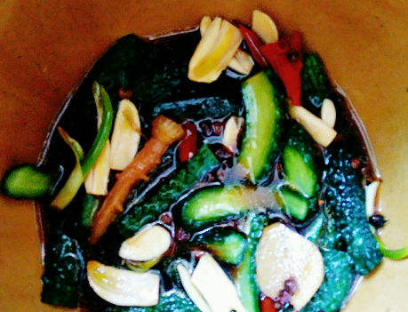 第四步,放入干红辣椒,将酱汁晾凉,处理好的黄瓜放入一个无水无油的容器中,加入大蒜、生姜,放入2勺白酒,将晾好的酱汁倒入;