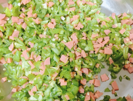 第三步,处理好的青椒切成丁用,火腿肠、青椒以及炒熟的鸡蛋混合放入一个容器中,加上点蚝油、食盐和少许的胡椒粉,混合搅拌均匀;
