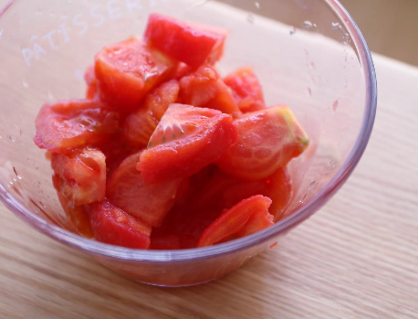 制作过程:第一步,番茄一个,清洗干净,将其放入在开水中烫2分钟,看到皮裂开的时候,便可将番茄皮去掉,番茄切成稍微小一点的块;