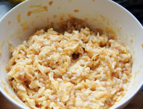 第三步,萝卜丝腌制好,无需倒水,直接放入葱姜末,磕入一个鸡蛋,加上点十三香,分次少许在其中加入面粉,搅拌成比较粘稠的状态;