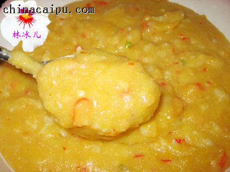 4、也可以拿上面的原材料做一道面糊糊,这道菜的热量就低多了,锅中放油炒香姜蒜末,加入高汤(清汤+浓汤宝也行)等开锅后别放入榨广椒加搅拌至浓稠即可装盘食用,还可以往里面放入些长的青菜,这样子面糊糊就会均匀的裹在青菜上,吃的时候又是另一番风味