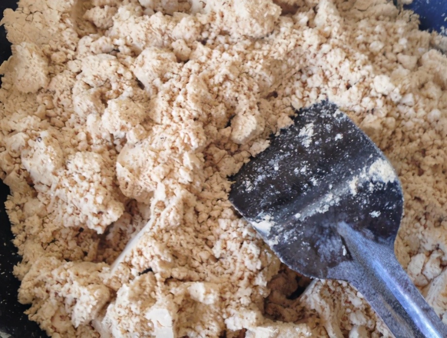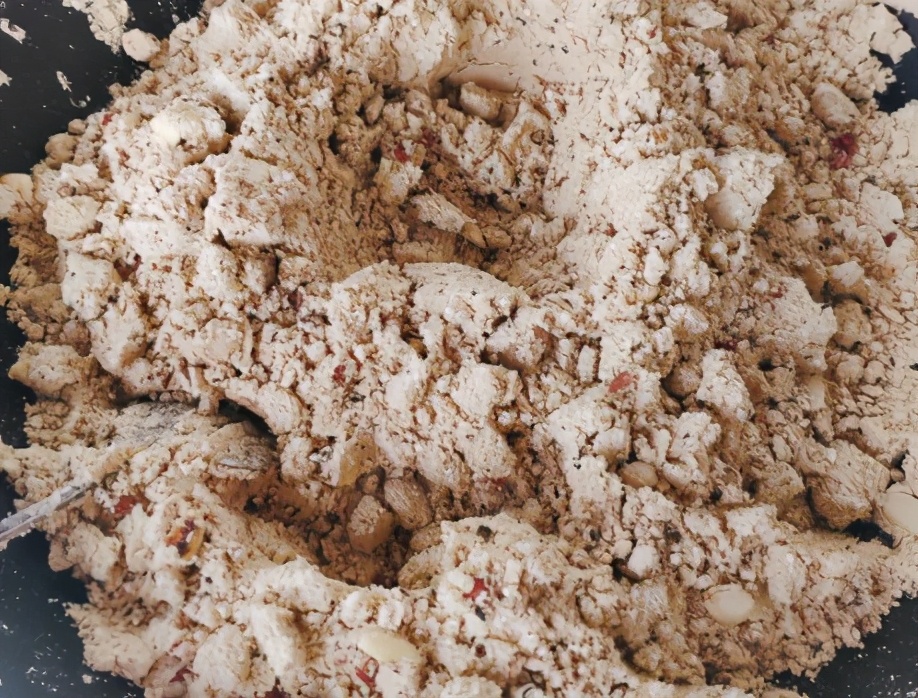 第五步,将准备好的干果放入,再次混合翻炒均匀,油茶面就做好了,取一个碗,放入2大勺的油茶面,加上一勺食盐,缓缓冲入热开水,搅拌成比较稠的糊状,稍微晾一下,不烫嘴的时候就能喝了。