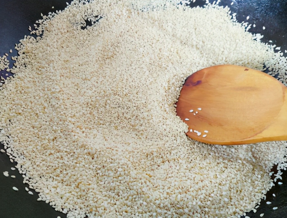 第二步,差不多5成热,将白芝麻倒入在锅中,小火开始翻炒,记得要间歇性地翻炒,同时可以借助晃动锅体让其均匀受热;