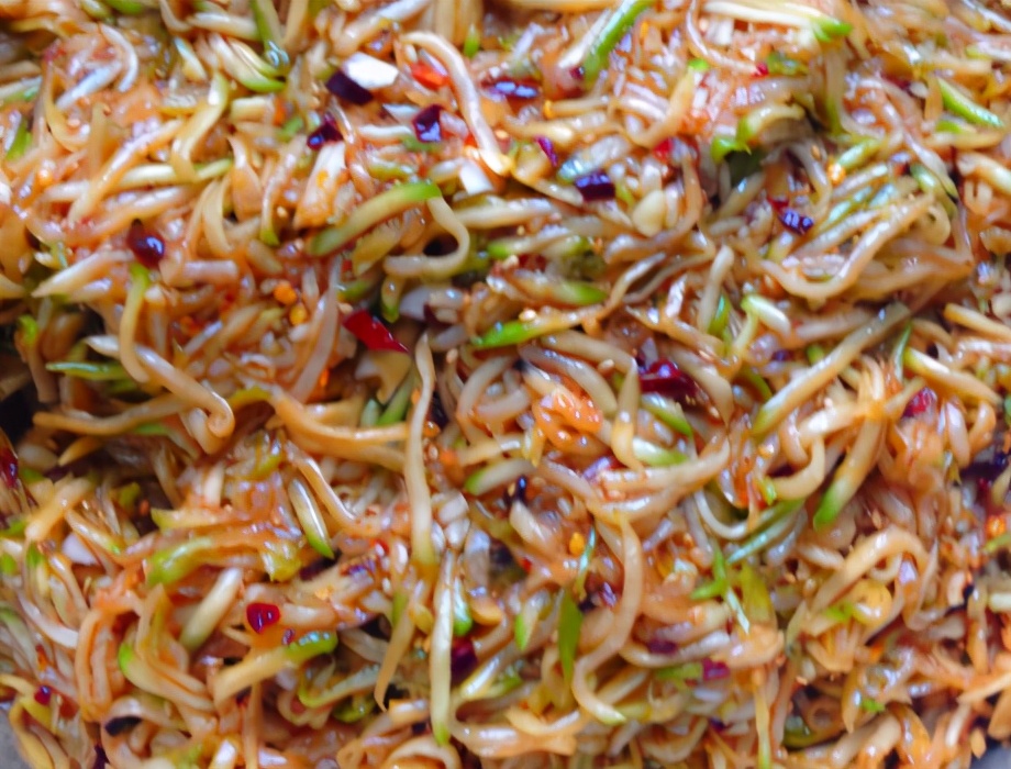 制作过程:第一步,芥菜疙瘩首先要洗干净,并且切去不能吃的部分,将芥菜疙瘩分别擦丝,摆放在一个容器中,放在太阳底下晾晒;