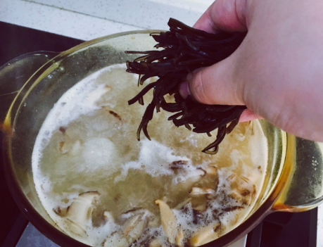 第三步,先将香菇和胡萝卜丝放入锅中,待锅再次煮开后,便可放入豆腐皮和火腿丝煮,煮1-2分钟的时间,便可将豆腐块放入锅中;