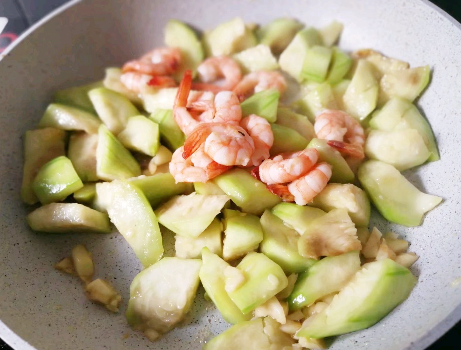第四步,差不多3分钟的时间,看到丝瓜块发软的时候,便可将虾仁放入在锅中一同翻炒,过程中丝瓜会出水,继续炒至虾仁变红色并且卷曲的时候;