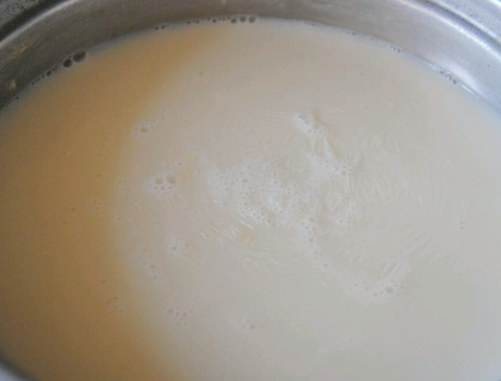 第三步,将豆浆打好后,仔细过滤几遍,然后放入在煮锅中,小火将其加热,煮至沸腾的时候继续煮3分钟,便可关火,煮好的豆浆静置5分钟,晾至85度左右;