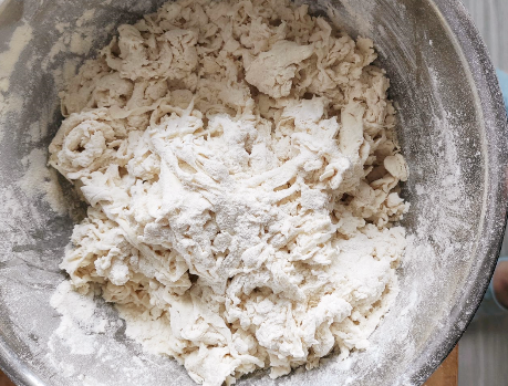 制作过程:第一步,面粉放入大碗中,分次少许加入水,揉成一个光滑的面团,盖上保鲜膜松弛30分钟的时间,这个过程中准备馅料;