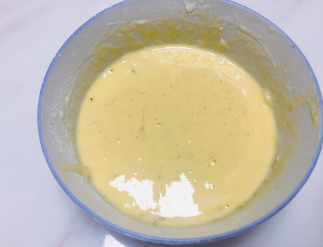 第四步,然后再磕入2个鸡蛋搅拌均匀,加上一点食盐,带鱼腌制好后放入蛋糊中裹一圈,锅中添油,烧热后放入带鱼段小火开始慢慢炸;