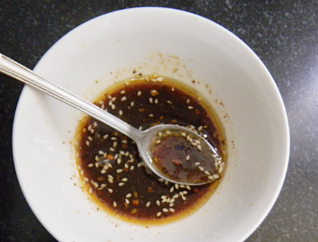 第三步,马齿苋挤干水分后,切成段用,准备一个小碗,放入食盐、醋、酱油和香油,加上点熟白芝麻,混合搅拌均匀成料汁,大蒜准备适量,剥皮后;