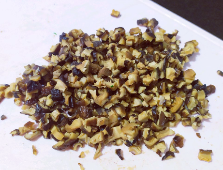第三步,香菇准备适量,去掉根蒂后,清洗干净,将香菇切成小碎丁,同时豆干也需要切成小碎丁,将所有的食材混合在一起,加上点食盐和生抽调味;