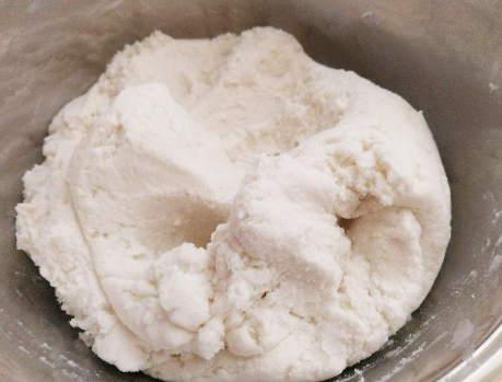 第三步,盖上保鲜膜静置一会,然后将其移至在案板上,揉搓整理成长条状,分成大小适中并且均匀的面剂子,分别揉搓成圆球状,取一份面剂子;