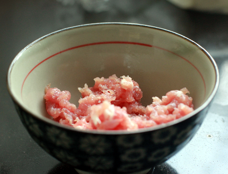 制作过程:第一步,一盒嫩豆腐,将其去掉包装袋,豆腐简单用清水冲洗下,然后将其切成片,控水后,待用,猪肉一小块剁成细细的末;