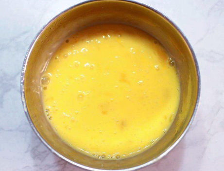 第二步,用筷子将其打散成液,多搅拌一会,最好是搅打至出现小泡沫的状态,然后在其中加入温开水,水和鸡蛋液按照1:1的比例做便可;