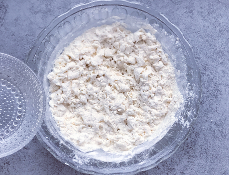 制作过程:第一步,面粉放入在大碗中,分次少许加入开水,用筷子将其搅拌均匀,这个方子中用到的水比较多,面团比较稀软;
