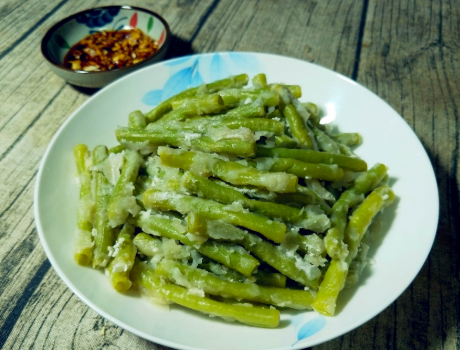 备用食材:豆角255克,面粉30克,鸡蛋1个,大蒜5瓣,味极鲜1勺,米醋2勺,香油少许;