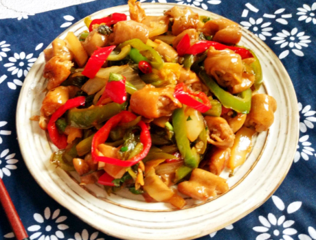 第五步,待将肥肠中的水分炒干后,加上点蚝油、白糖、酱油,沿着锅边淋入点醋翻炒均匀,将青红椒放入,翻炒一会后,淋入水淀粉勾芡便可出锅。