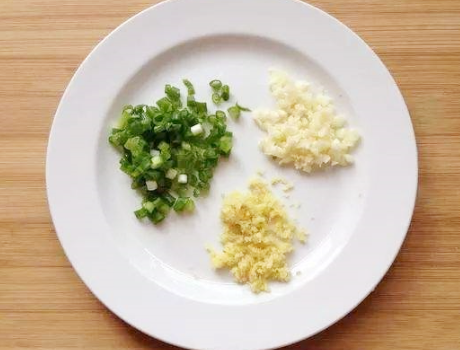 第三步,放在一旁静置腌制10分钟的时间,过程中将葱姜蒜准备出来,分别将其处理干净后切成细细的末用,待将虾腌制好后,加上2勺干淀粉;
