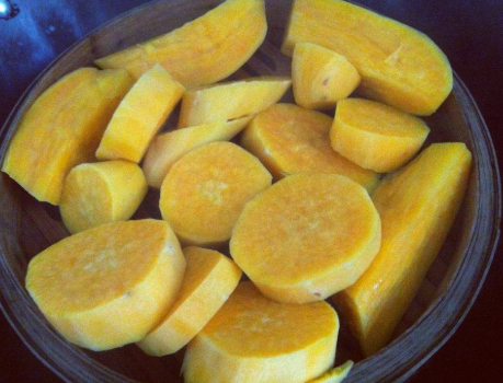制作过程:第一步,红薯2个,将其削去皮后仔细清洗干净,然后将红薯切成块,在锅中添上水,隔水放入切好的红薯块将其蒸熟;