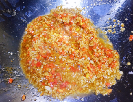 2、蒜蓉需要事先下锅炸一下,将其炸至金黄的状态,做的菜肴口感才会更加好,记得在炸蒜蓉的时候,根据个人的喜好搭配点剁椒酱,这样整体的口感更佳,记得炸的过程中小火慢慢炸,防止炸糊了;