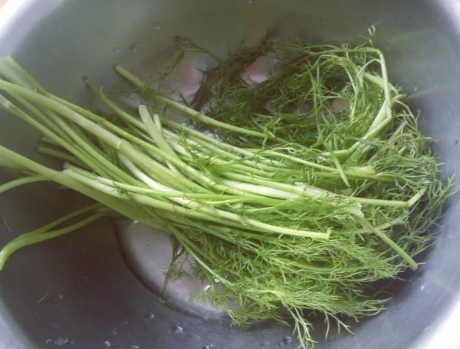 第二步,分次少许倒入葱姜水,将其用筷子朝着一个方向搅拌均匀待用,茴香一把将其摘去根蒂后,仔细清洗干净,控一控其中的水分,然后将茴香切成末;