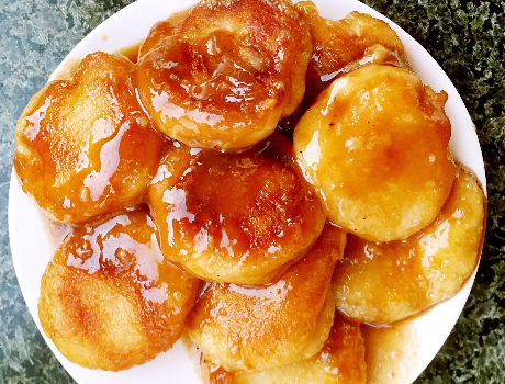 第五步,直到将每一个糯米小饼都可以均匀粘裹上糖汁,并且汤汁浓稠的时候,即可出锅,撒上白芝麻点缀即可享用。
