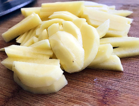 制作过程:第一步,土豆削去皮后将其清洗干净,一个碗中,放入点食盐,然后加入清水化开成淡盐水,将土豆放入清洗干净,然后将土豆捞出,切成如同手指一般粗细的条状;