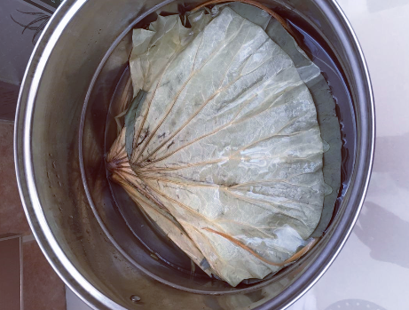 2、荷叶事先泡软后,需要放入开水锅中煮一下,更加干净卫生,做叫花鸡的面团需要用发面,其有更好的延展性,烤的效果也会非常好;