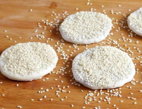 3、卷的时候一定要一边抻一边卷,这样做好的饼层次才会更加多,在饼上粘上白芝麻后,需要用手轻轻按压下,使得芝麻可以粘裹更加牢固一些。