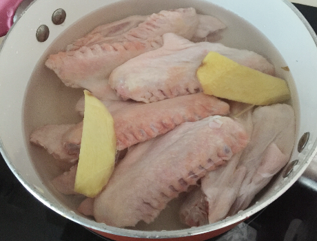 制作过程:第一步,鸭翅准备出适量,将其事先清洗干净,然后将其从中间剁开,锅中添上水,冷水放入处理好的鸭翅,加上花椒、姜片和料酒,大火将其煮开;