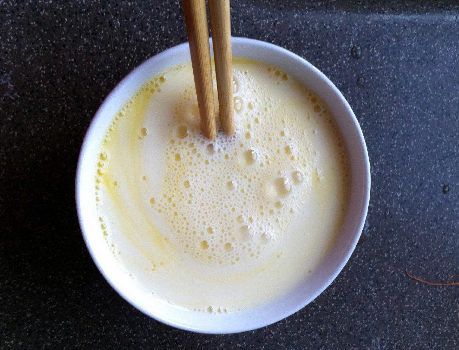 制作过程:第一步,鸡蛋2个磕入在碗中,将其打散,多搅打一会,最好是出现小泡沫的状态,牛奶准备出适量,将其隔水加热,然后晾至30度左右;