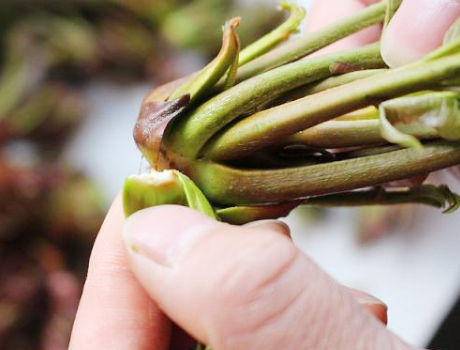 制作过程:第一步,香椿芽最好是选择连接在一起的,不要太分散了,将香椿芽的根部切去一点点即可,然后将其仔细抓洗干净,在锅中添上水,加上一点点食用油;