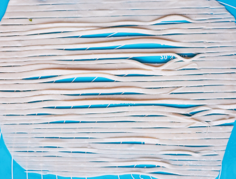 第三步,在揉面垫上涂抹薄薄一层食用油,取一份面剂子,将其擀成长方形面片,越薄越好,然后用菜刀将其切成细条,注意两头不要切断了;