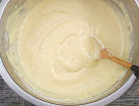 第四步,放在温暖的地方发酵,发酵好的面糊会有不少的气泡,用刮刀翻拌一下,顺滑无气泡的状态即可,将其倒入在模具中,并且轻轻震一下;