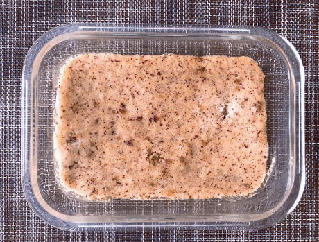 第三步,启动程序将其打成糊状,打好的山药红枣糊盛出,准备出要上锅蒸的容器,在其中刷上薄薄一层玉米油,然后将打好的糊状倒入在其中;