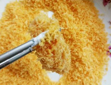 第四步,待将鸡胸肉腌制好之后,将鸡胸肉先粘裹上淀粉,然后再裹上鸡蛋液,最后再放入面包糠中裹一圈,待将所有的鸡块都处理好之后;