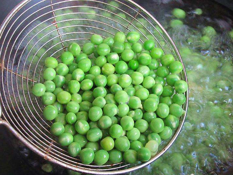 第二步,青豌豆准备适量,将其外壳剥去后,豌豆用清水冲洗干净,煮锅中添上水,待将水烧开后,滴入几滴食用油,将豌豆放入在锅中焯下水;