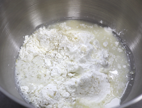 制作过程:第一步,酵母粉放入一个碗中,在其中加入温度约为30度的温水,将其化开,静置片刻,分次少许倒入在面粉和白砂糖的混合物中,搅拌至没有干面粉的状态;