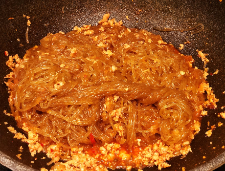 3、炒粉丝的时候,建议用筷子翻炒,这样更加易于操作,粉丝下锅后,快速抖散,而且注意粉丝炒的时间也别太久了,否则容易影响口感。