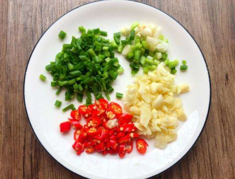 第二步,大蒜3瓣,剥皮后将大蒜切成末,小米辣去掉根蒂清洗干净后切成圈,香葱2根摘洗干净后控水切碎,待将所有的食材都准备到位后,即可开始炒菜;