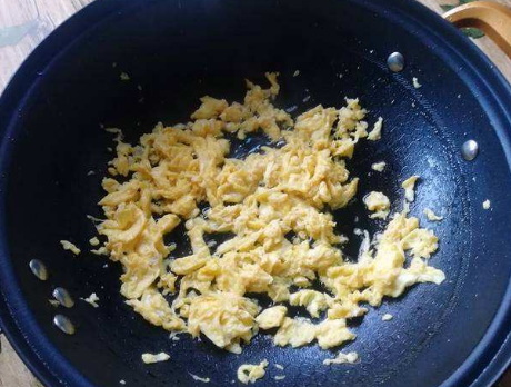 第三步,鸡蛋磕入碗中,加上少许料酒将其搅打成液,在炒锅中添上少许食用油,烧热后淋入蛋液,将其炒熟划散盛出,虾仁腌制好之后剁成泥,接着将处理好的鸡蛋液、虾泥和菠菜碎混合;