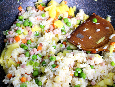 第四步,锅中留底油,将米饭放入,快速用锅铲铲散,翻炒均匀后,加上胡萝卜丁、青豆和甜玉米,将其充分翻拌均匀,然后放入炒好的虾仁,同时加上点鱼露充分拌均匀;