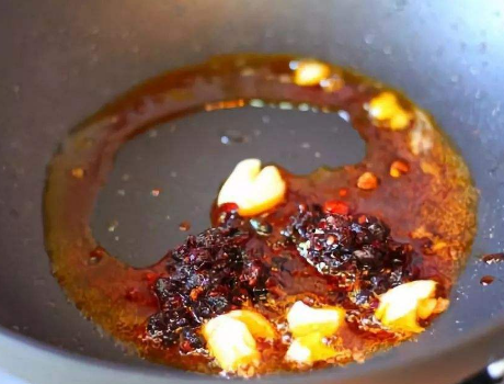 第四步,待将鱼煎至两面金黄后即可出锅,重新在锅中添上点油,放入蒜末、姜末、豆豉和小米辣,小火煸炒出香味,然后放入豆瓣酱和辣椒酱,再次煸香,将事先煎好的小黄鱼放入锅中;