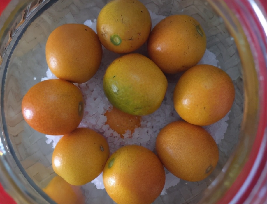 3、盛放金桔的容器也需要保证无水无油,金桔可以保存的时间久,不易变质,腌渍金桔,需要按照一层金桔一层盐放,这样金桔才能腌渍均匀,咸金桔虽说放的时间越久越好,但起码要保证其不会变质才可。