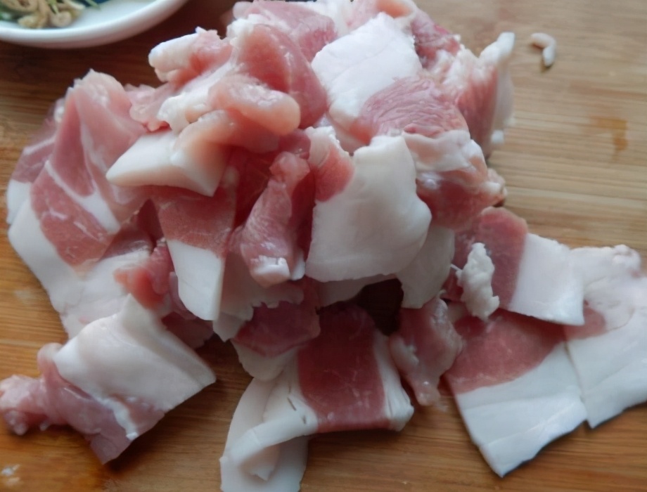 第二步,五花肉一小块切成片,同时大葱择洗干净切成片,大蒜剥皮后切成片,1勺淀粉用2勺清水化开成水淀粉,待将所有的食材准备好后,便可开始炒菜;