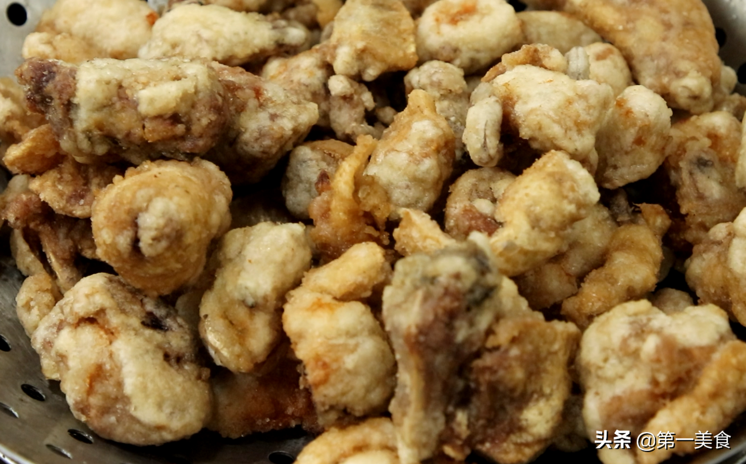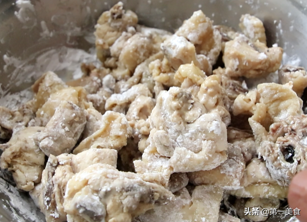 锅内烧油期间给腌好的鸡块裹上一层干淀粉。