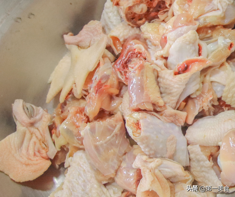 使用半只仔鸡即可,剁成均匀小块儿备用。