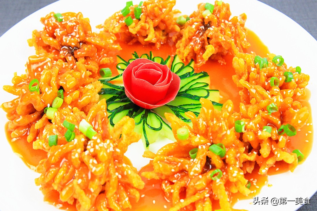 9.最后起锅均匀浇在菊花鱼上面,撒上葱花和熟芝麻美味即成。