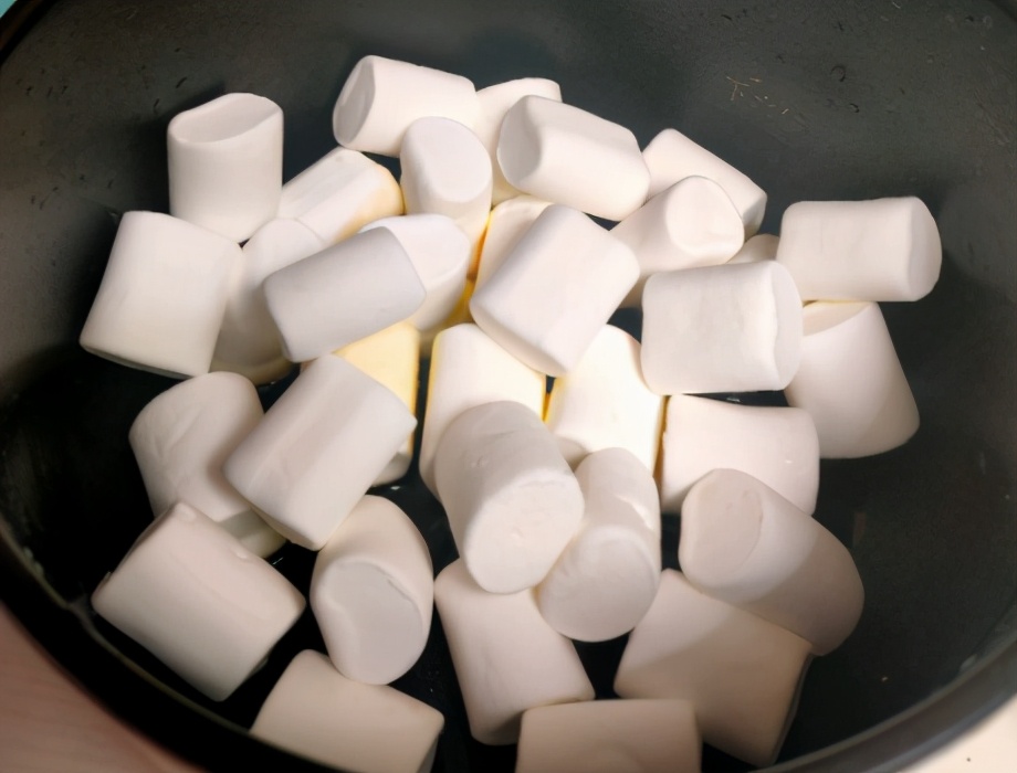 2、熬棉花糖记得要全程小火,最好用不粘锅,否则很容易会浪费食材,如果棉花糖本身不是很甜,可以自行添加8-10克的白砂糖增加甜味,棉花糖要用刮刀来回翻拌,融化棉花糖的过程比较费时间,大家需要有耐心,慢慢将其充分融化;