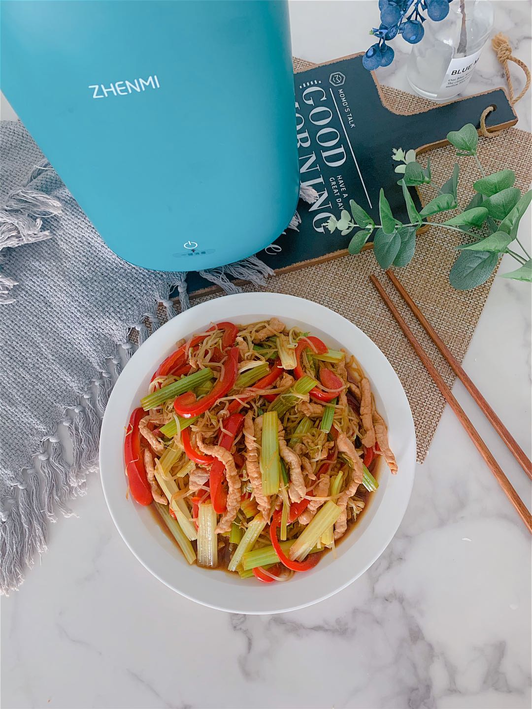 超级好吃的豆芽芹菜炒肉丝就做好啦,大人小孩都爱吃。